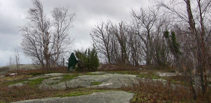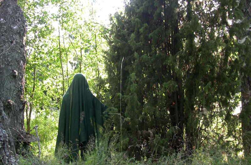 The green scarf I chose partly in order to merge with the vegetation (the hue is actually too bluish for that). The inspiration for covering my head with the scarf came from an article about bear rituals based on interviews with contemporary Khanty- and Mansi- women. (Juslin 2007) In the bear ritual a dancing woman’s entire upper body is covered with a shawl; both the head of the animal and the dancing women are covered. (Juslin 2007, 15). I imagined the dancer could simulate the spirit of the bear under the shawl, perhaps even become the bear in some way. Covered by a green shawl, the human figure resembles a juniper and enables a visual merging with the environment. I was not performing “as” a juniper, though, but together with it. The impact of the shawl as a cover, a camouflage and a costume was important. It facilitated an imaginary identification with the juniper, produced intimacy through a concentration of the space, aided in achieving mental focus via visual simplification, served as protection from possible intruders or extensive stimuli, like birds, and enforced awareness of the breath inside the space created by the shawl.