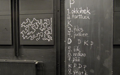 The space had posters taped on the floor or on the walls that gave detailed instructions on what the audience was asked to do in the different areas. In the midst of greeting the visitors and sometimes guiding or participating in their explorations in the space, Helka-Maria and I improvised with the short scenes we had been working on. We gave non-sensical names to our materials and wrote them on them on one the walls. We silently agreed on moments when to turn to performing them, as we had done so, we crossed over the related chalk writing on the wall.