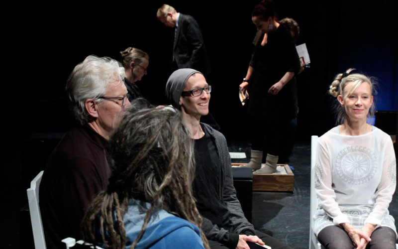 From the beginning it was clear to us that we were interested in our embodied experiences and how they could inform the construction of the performance. In exploring breathing and diverse physical routines drawn from body psychotherapy together with Helka-Maria, we paid attention to our observational and emotional attitudes and how they affected our postures, movement, and use of voice. We used these insights to recite texts we wrote and edited about the history of our bodies. We created short scenes of exaggerated physical characters that exemplified typical attitudes we found that we often embody in our everyday lives. Through this kind of pre-performance exploration we were creating the groundwork of our performer’s dramaturgy that became translated into a dramaturgy of the whole performance.