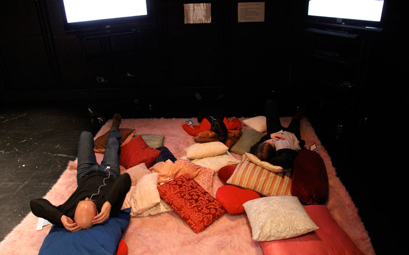- Breathing corner: An area with two screens featuring video-material of body parts moving in the rhythm of breathing and a rug and pillows to recline on. The area also had six iPods for the visitors to use. They contained taped instructions to listen to the breathing on the tape and to slow down one’s own breathing.