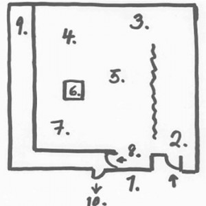 Each performance lasted for two hours. The audience-visitors were invited to stay as long as they wished after entering. A group of them was allowed to enter every fifteen minutes in pairs of two. Helka-Maria and I welcomed the visitors at the entrance to the space. We gave them a small booklet we called the performance passport that contained material from the body stories that we had written. They had bare pages and an attached pencil for the visitors to add in their comments. Helka-Maria and I also utilized the texts in these booklets for our intermittent dialogues, too. We stroked the visitors’ backs from head to heels and drew their footprints on the floor before sending them into the space, where they could observe and do things at their own pace. The spatial set-up involved the following nine scenes that were introduced in the handout by the italicized text and by the accompanying map that was drawn by Helka-Maria: