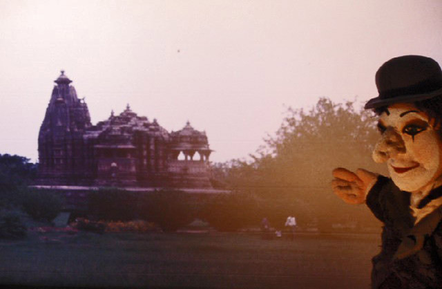 Näytteleminen teatterin muissa produktiossa oli kummankin päätyö. Syksyn mittaan teimme viisi ensi-iltaa, joissa kaikissa olimme mukana. Ohjelmistoomme kuului myös Daniel Katzin lastennäytelmä Silleri karkuteillä, johon Rainer teki paperimassasta puolinaamiot. Näyttelin puolinaamiossa Taika-Bobin roolin.*2 Kuten nukketeatterissa kävijät tietävät, käytetään toisinaan nukkien lisäksi myös naamioita. Näyttelijä naamio kasvoillaan pienen nuken rinnalla on usein nähty keino kuvata vaikkapa jättiläistä tai isoa eläintä. Olimme naamion osalta jo nukketeatterin puolella.