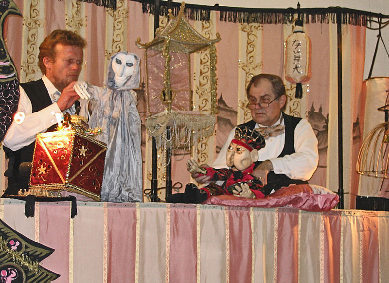 Vietin aikaa ja juttelin vierailijoiden kanssa niin paljon kuin mahdollista. Katselin näyttämön rakentamista, selvitin itselleni, miten lavastustekniikka toimi, miten nuket liikkuivat näyttämöllä ja miten nukkeja säilytettiin esityksen aikana. Sain hyvän tietopaketin siitä, miten koko näyttämön suuruinen esitys oli tehty ja miltä kaikki näytti näyttelijän näkökulmasta käsin. Esitys näyteltiin sermin takaa. Leveä kevytrakenteinen sermi oli pystytetty näyttämön etureunaan. Lavasteet oli rakennettu pyörillä liikkuville statiiveille. Siten isot esineet, kuten talot ja vuoret, sai helposti tuotua paikoilleen ja vaihdoissa vietyä pois. Näyttelijät käyttivät näytellessään koko näyttämötilaa, eivät vain reunaa, kuten väkisinkin tapahtuu pienellä tirkistyskaappinäyttämöllä. Käytimme seuraavana syksynä samaa tekniikka pienimuotoisesti myös omassa esityksessämme.